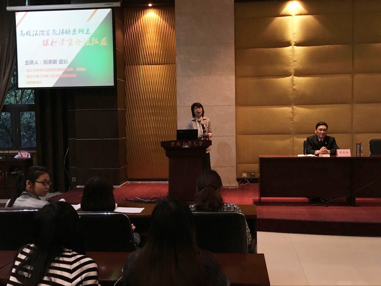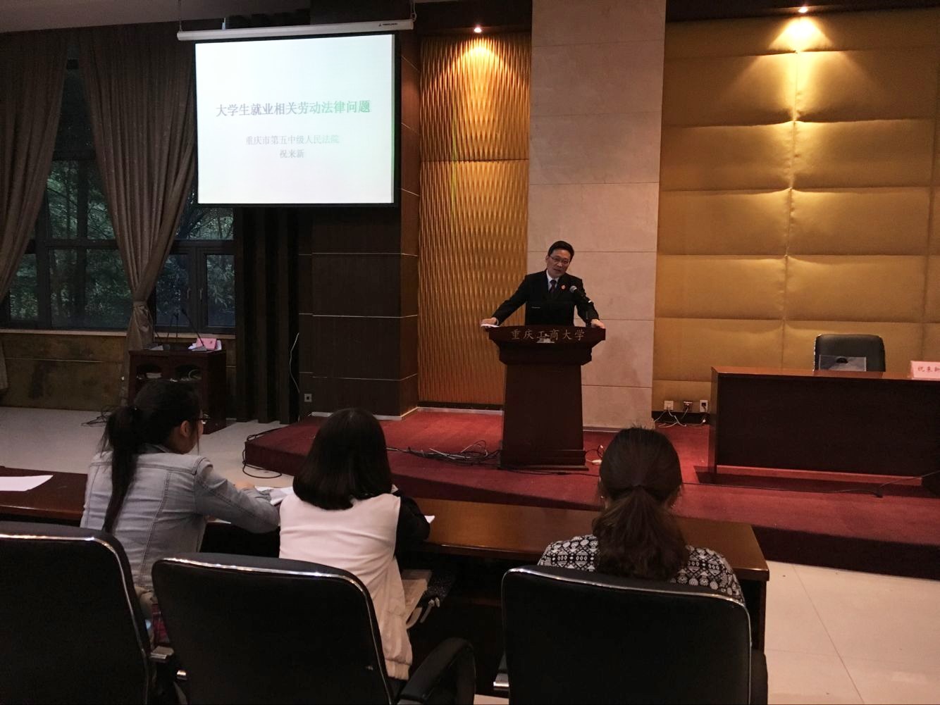 2016年4月26日晚,高校法治宣教活动系列之保护员工合法权益法律讲座在田家炳书院408报告厅成功召开。重庆市南岸区法院原党委组织成员、副经理,重庆市第五中级人民法院省委会成员、民四庭庭长祝来新;原重庆市南岸去法院副经理、原重庆市第五中级人民法院宣教处副处长陈绍惠受邀就老员工就业相关劳动法律问题进行知识宣讲。财政公司党总支杨萍书记、分团委徐阔书记、员工联络员杨佳妮及员工代表张明佳出席了本次讲座。