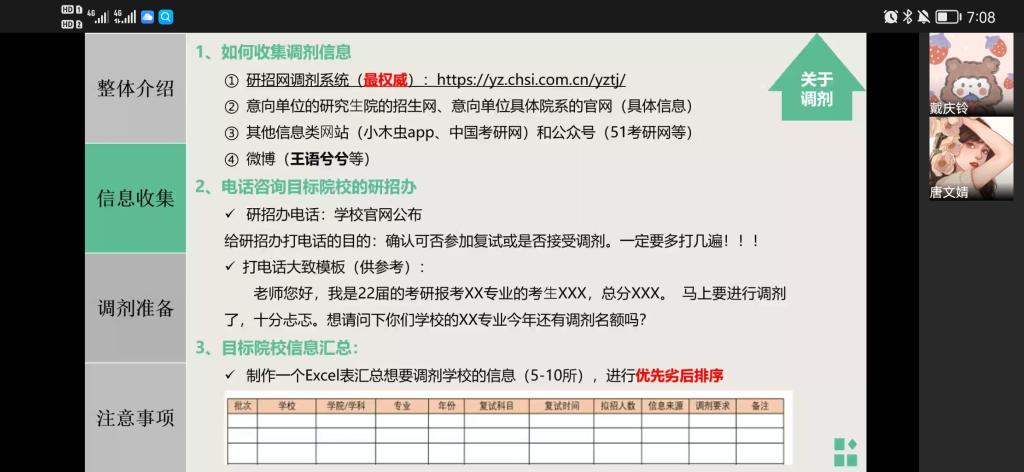 17保险二班张丹(西南财经大学保险专硕)在提到复试流程时,表示要注意熟练专业英语的应用,同时要区分好复试时是交流式还是非交流式。她以自己准备复试的经验为例,强调复试可以准备一个万能的英语话题,最好是以背诵朗读式的方式练习,以利于随时套入复试时的问题;随后,她告诉大家最好从专业、英语、以及报考院校的往年相关问题等方面进行准备;接着,她鼓励初试成绩没发挥好的同学们不要紧张,准备好场外因素;最后,她提到调剂要了解相关规定,并从学长学姐、微博超话、学校官网等多方面获取调剂的信息。