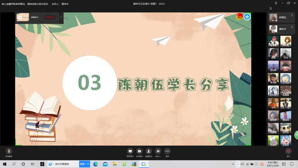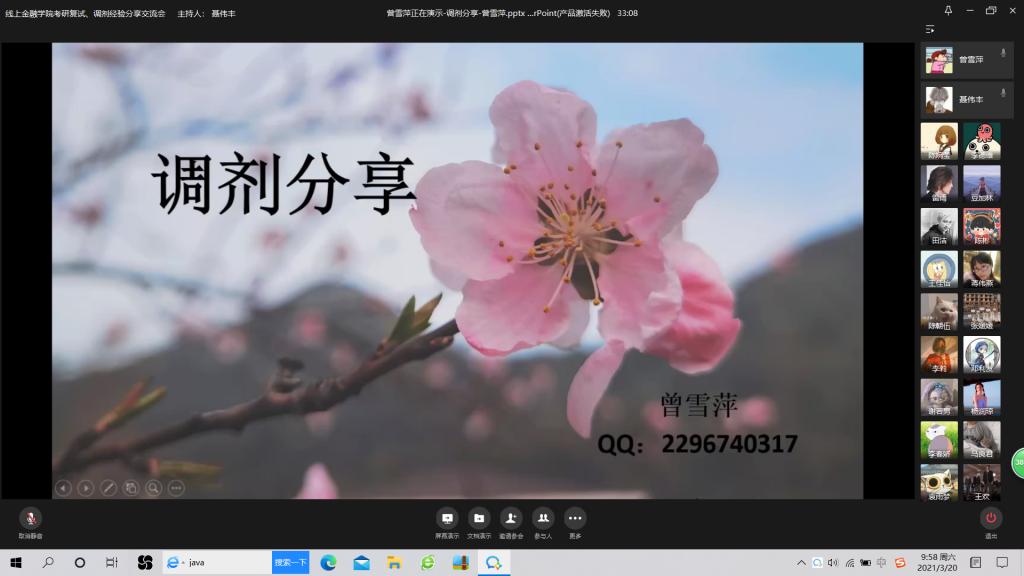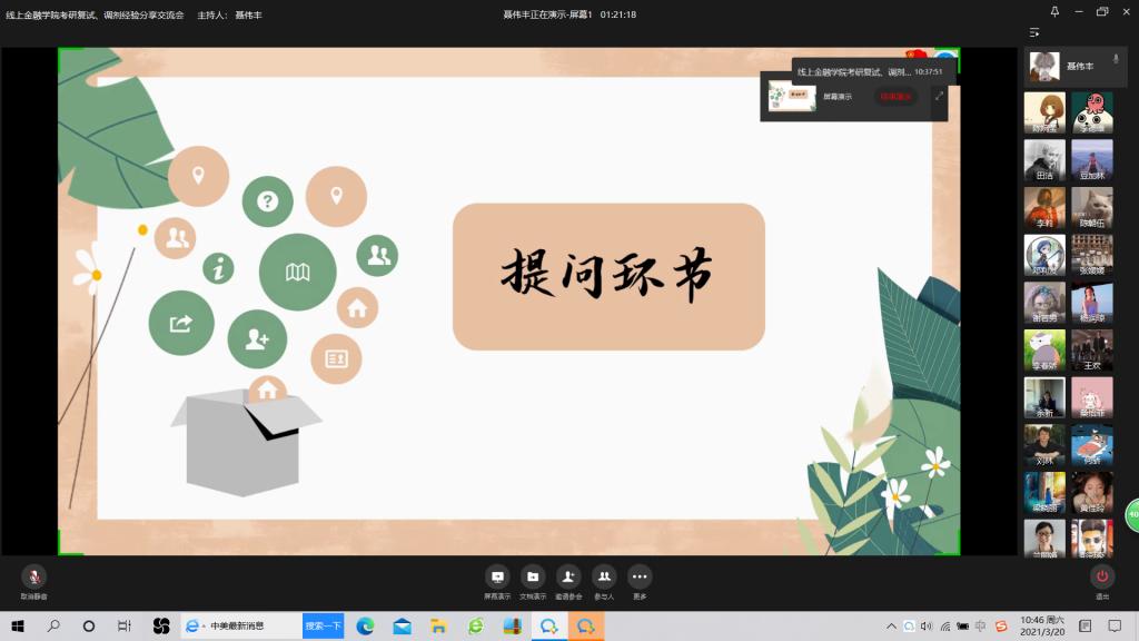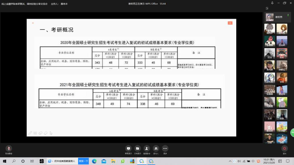 3月20日上午9:30,点点taptap官方网站成功举行了“点点taptap官方网站考研复试、调剂经验分享”线上交流会。此次交流会邀请了2020届考研成功的五位员工:杨润琼、陈朝伍、曾雪萍、刘柯岚、谢若男来分享关于复试和调剂成功的相关经验,为同学们答疑解惑。公司党委书记、副经理王建明,党委副书记、纪委书记余新出席了本次交流会。