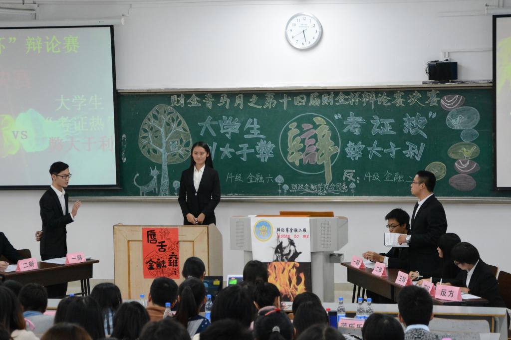 比赛在一段对以往精彩表现回溯的PPT以及双方辩友风采视频中缓缓拉开帷幕,观众们置身于辩手的世界中,充分领略了他们一路的风采与艰辛,同时感受着辩手们的雄心与蜕变。紧接着正方一辩从证书的定义、分类、意义等方面打响了本场比赛的第一枪,反方一辩则从证书的干扰性及浪费性予以强有力的反击。在接下来的盘问、驳论、攻辩环节中,正反双方亦是运用其铜唇铁舌,引经据典,针锋相对,或从容淡定、或激情飞扬地为观众们带来一场脑力饷宴。值得一提的是,在自由辩论环节中,正方辩手别具一格,采用依次发言的形式让观众们眼前一新。在双方四辩的声情并茂与妙语连珠中,本场比赛告一段落。