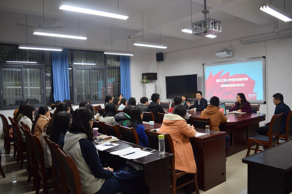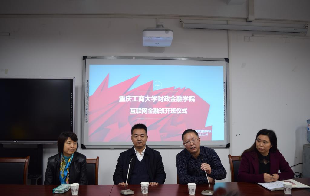 2016年11月7日下午15:30,点点taptap官方网站财政点点taptap官方网站首届互联网金融班开班仪式在南岸校区田家炳313会议室举行。重庆市金融发展中心主任张洪铭、财政公司党总支书记杨萍、常务副经理莫云、金融系主任许世琴、分团委书记徐阔出席此次开班仪式。