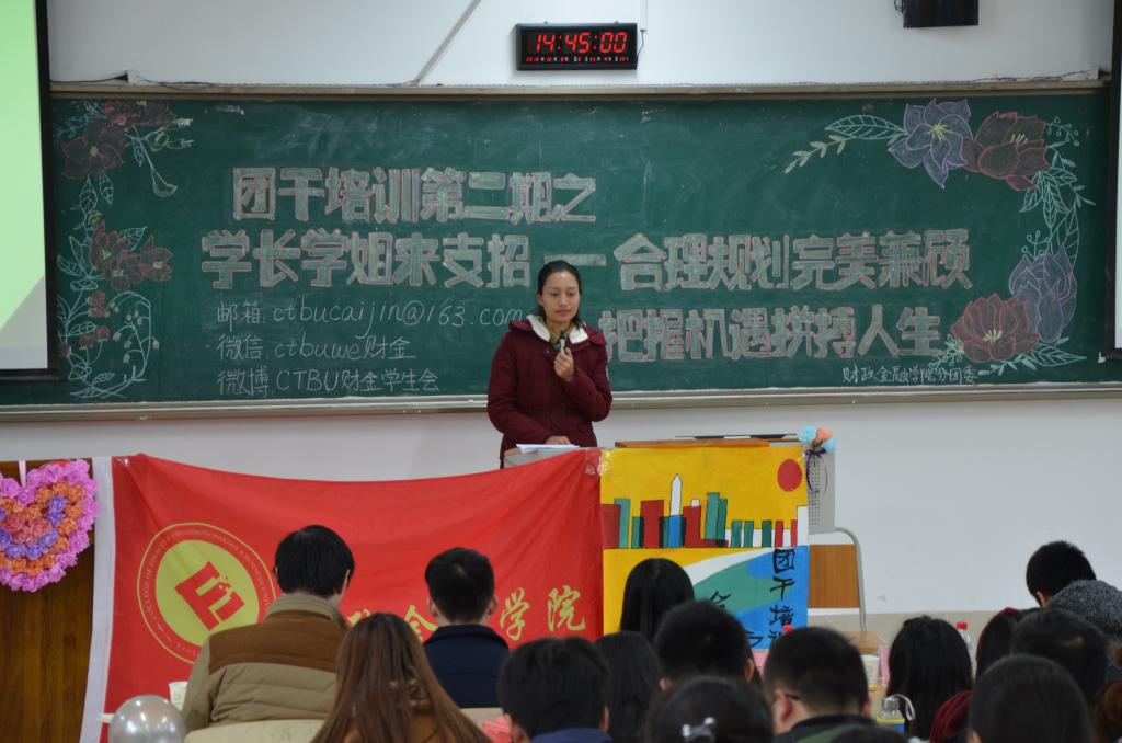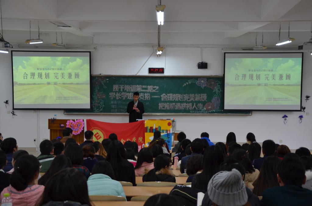 2016年12月2日14:30,财金青马月系列活动之团干培训第二期在南岸校区博智楼07221圆满举行。本次团干活动的主题是“合理规划,完美兼顾”。优秀学姐陶小兰、刘良丽,优秀学长黄金水、刘润哲与财金学院各班级班长、团支书以及员工会主席团、各部门部长共同参与了本次活动。