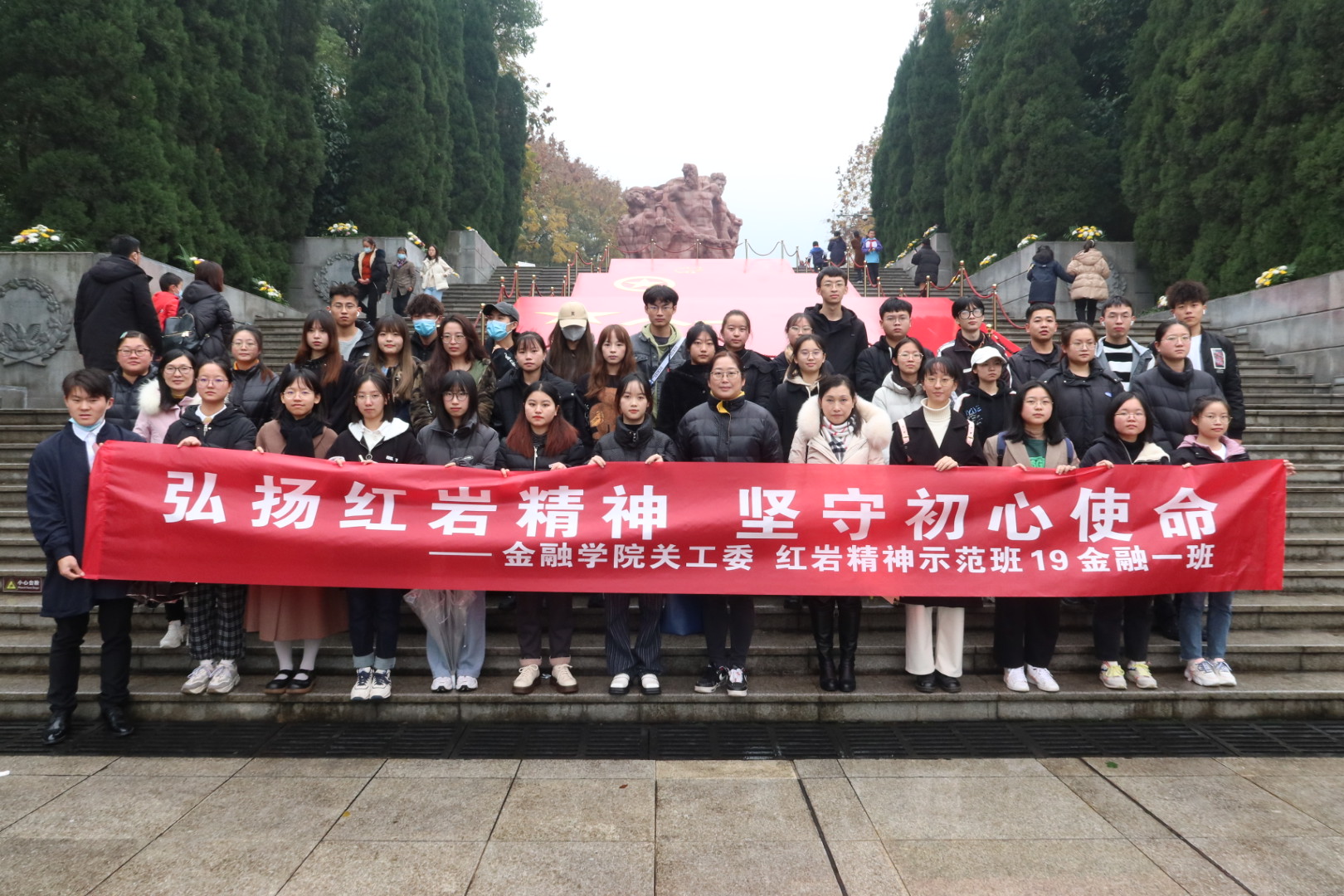 为铭记革命历史,弘扬红岩精神,坚守初心使命,11月27日下午,点点taptap官方网站关工委组织“红岩精神示范班”19金融一班全体同学赴重庆市沙坪坝区歌乐山烈士陵园开展“11.27”纪念活动。公司党委副书记、经理王兰,党委副书记、纪委书记余新,学工办副主任、分团委副书记兰丽娟及辅导员乔明月参加了活动。