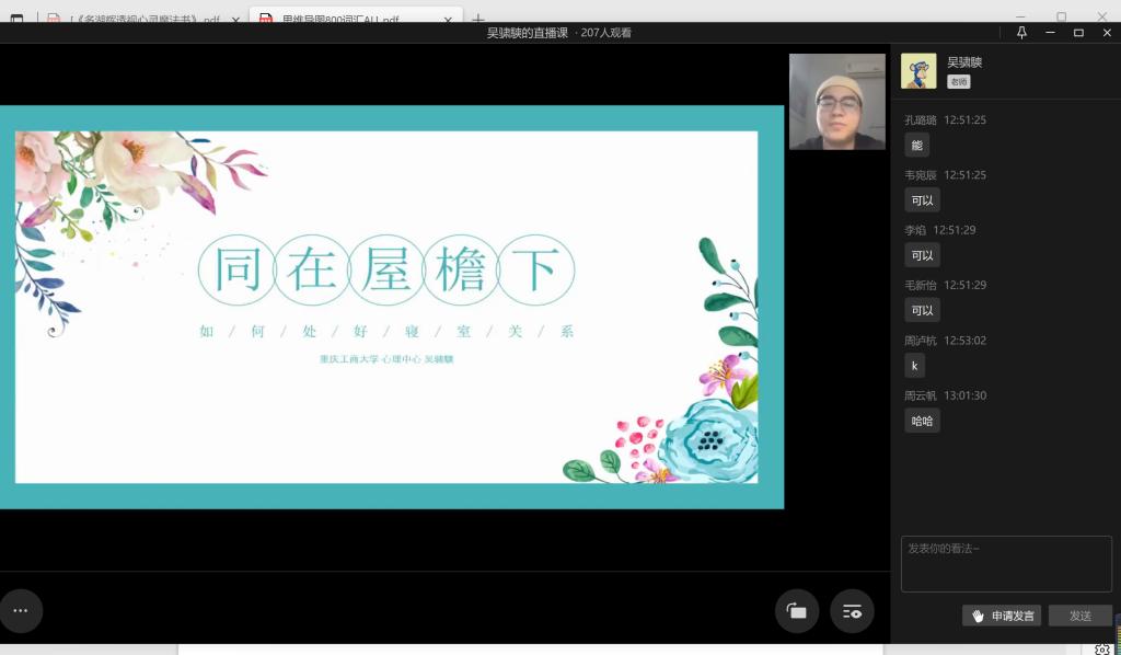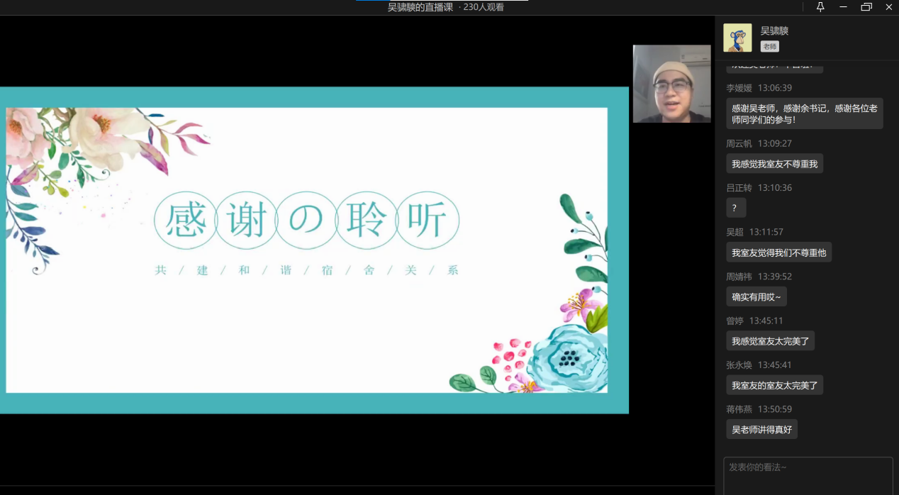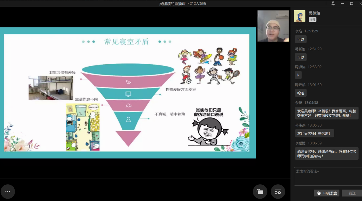 2022年11月11日中午13点,点点taptap官方网站心理工作站主办的“同在屋檐下——和谐寝室关系”心理讲座于企业微信线上平台顺利举办。此次讲座邀请到了学校心理健康教育与咨询中心吴骕騻老师作为主讲人,讲座内容丰富、寓教于乐,受到了同学们的热烈欢迎。