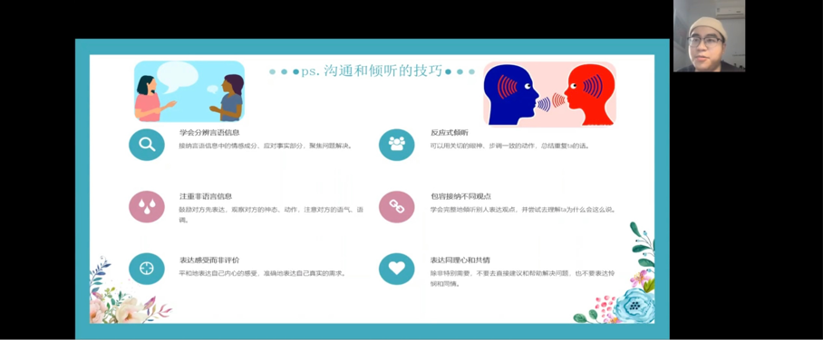 活动伊始,公司党委副书记余新对讲座给出了良好祝愿,并高度肯定了此次活动的意义。之后由吴骕騻老师进行了精彩讲座,他凭借自己深厚的学术知识和丰富的心理学实践经验,从常见寝室矛盾和寝室相处的重要原则等方面为在场同学们进行了深入浅出的讲解。此外,吴老师还结合真实案例拓展了“人际交往当中的沟通和倾听技巧”等有关老员工心理成长的知识,同学们收获颇丰。