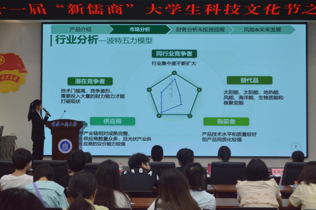 本次比赛共收到作品121份作品,经过初赛的严格筛选,共有8支团队脱颖而出,进入决赛。决赛项目具有创新性和实用性,有轻办公系列的二合一订书压平机,还有为同学服务的Games赛事通,更有分体式可循环快递箱等技术创新的便民项目。决赛中,各支队伍准备充分,围绕产品或服务特性、市场分析、商业模式、财务分析、风险防范、发展愿景等方面进行项目展示,思路清晰,有理有据。项目答辩环节,评委老师们结合参赛队伍的作品特点与涉及的金融投资相关专业性问题进行提问,选手们积极思考和回应,彰显出较好的思辨精神和专业素养。答辩中,也为进一步完善项目提供了改进的方向和切实可行的建议意见。经过紧张而精彩的角逐,最后“钳所未有队”与“赛事通小队”荣获一等奖。