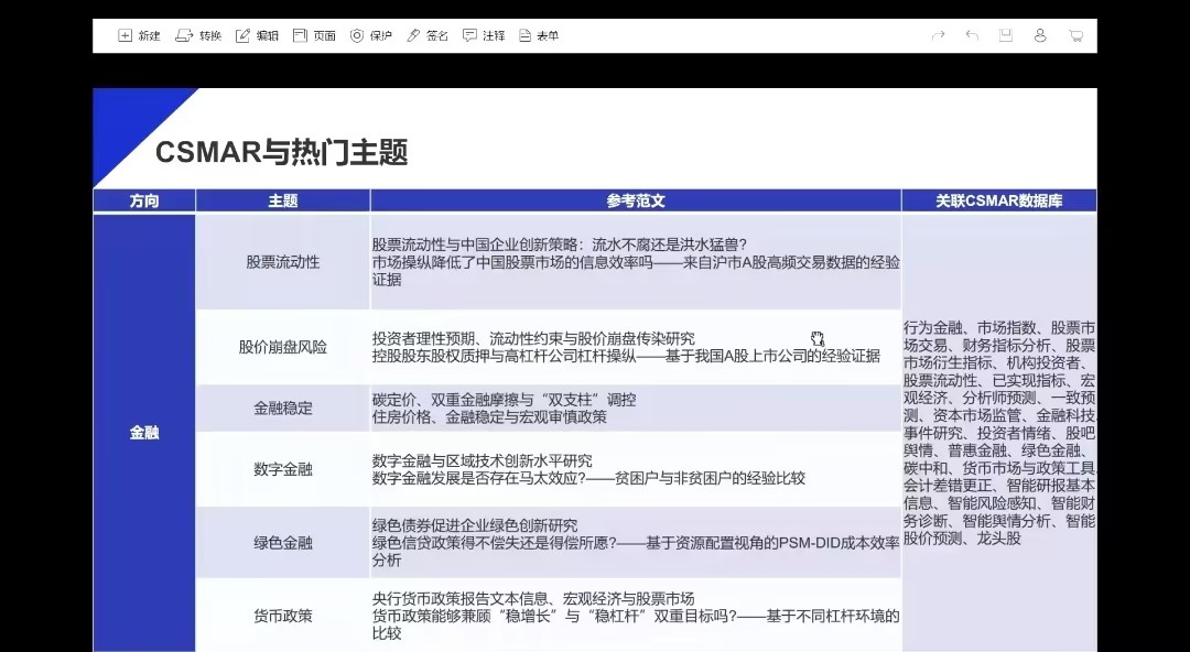 在讲座中,杨老师还重点讲解了CSMAR与实证研究创新。首先是热门主题,即采用CSMAR发文较多的研究主题,这是CSMAR的经典领域,为初次研究的员工提供了可借鉴的参考。在此基础上,还可以进行更前沿的主题研究,达到学术上的创新突破。最后,杨老师整理了一份关于热门主题和前沿主题的资料,供同学们学习交流,利用CSMAR学习更多的知识。