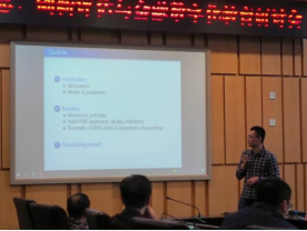王奕可博士以 “Investment-consumption-insurance optimization with multiple habit formation and non-exponential discounting”为主题进行了演讲,并与现场嘉宾进行对投资-消费-寿险优化的相关问题进行探讨。