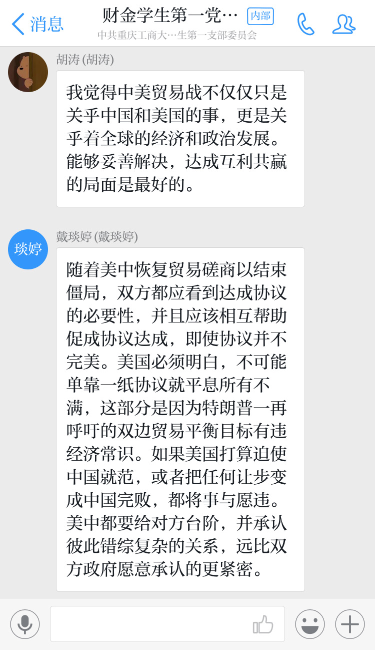 在交流中美贸易战这一热点新闻时,黄琼苇同志观点鲜明地表达在应对中美贸易摩擦问题上,盲目自信和一味恐惧都不是解决问题的办法,只有坚定地推动改革开放,坚定不移地发展自己,才能最终克服这个前进道路上的困难。其他党员同志们也表明我国应该坚守底线,而我们每个人身上都肩负着为祖国繁荣昌盛贡献自己力量的责任。本次线上学习也在同志们热烈的讨论中圆满结束。
