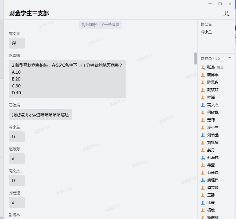 2020年春节前夕,新冠病毒肆虐,导致全国上下停工停产,在党中央的坚强领导以及一线医护人员的不懈努力下,目前疫情得到初步控制。为支持疫情防控工作,学校延迟开学,并开展了一系列线上教学活动。按照公司党委学习安排,员工第三支部在3月20日开展了本学期第一次线上组织生活会。组织生活会主要由党员同志领学新思想、共享感悟、防疫知识竞赛和总结发言四个环节构成。