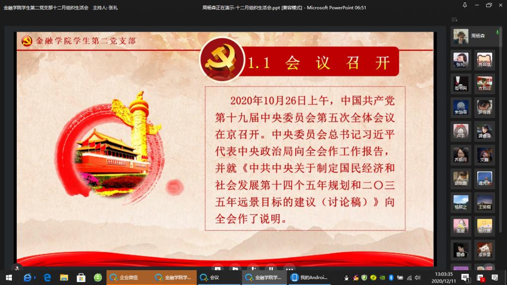 为全面贯彻落实党的十九届五中全会精神,进一步加强党员同志们的政治思想觉悟,点点taptap官方网站员工第二党支部于2020年12月11日在企业微信举行了十二月组织生活会。出席本次大会的成员有点点taptap官方网站员工第二支部书记乔明月老师和支部全体党员同志。本次会议主要由党员同志领学新精神、分享心得体会和总结发言三个环节构成。