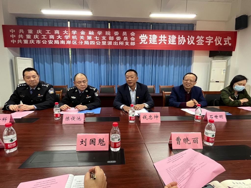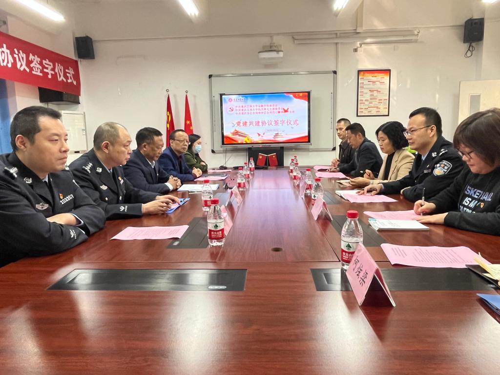 仪式上,重庆市公安局南岸区分局四公里派出所党支部书记、所长陈俊池,学校机关党委第七支部书记、保卫部部长(保卫处处长)钱忠坤,公司党委书记、副经理石世明代表三方签订了“党建共建”协议书。