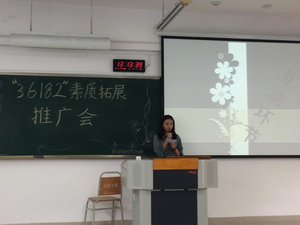 活动开始前的筹备工作由公司各部门协调完成,准备中各准备人员通力合作,齐心协力确保了活动的正常开展。活动于下午一点正式开始,活动分为四个环节:一是校素拓部长做简单讲话,二是讲解人员讲解36182素质拓展PPT,三是由两个趣味活动组成的互动环节,四是财金分团委员工会主席总结此次活动。活动中同学们认真聆听,积极参与,在一片融洽的气氛中同学们既增进了彼此的友谊,也对“36182”素质拓展活动有了更加深刻的认识。