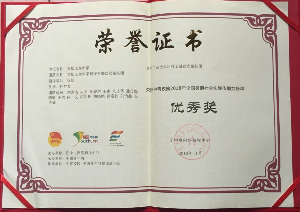 2018年12月19日,由团中央青年发展部、团中央网络影视中心主办,中国青年网、对外经济贸易大学团委承办的2018年“镜头中的三下乡”总结会暨中国青年网校园通讯社通讯站授牌仪式在对外经济贸易大学举行。公司三下乡团队队长林哲苏赶赴北京参与本次会议。本次会议有300余所高校参加,其中包括清华大学、中央财经大学、华中师范大学、武汉科技大学等其他高校。在本次由团中央举办的2018年“镜头中的三下乡”活动评选中,公司荣获全国百强传播力团队表彰。