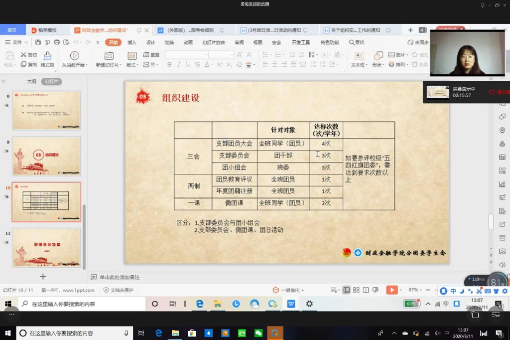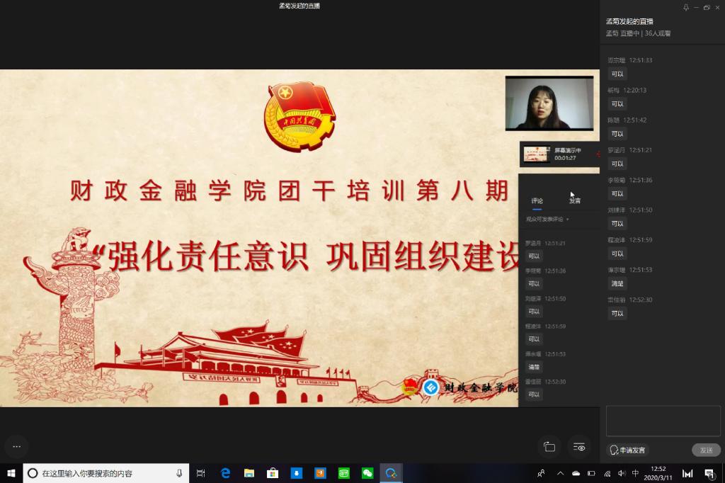 受疫情影响,财政点点taptap官方网站于2020年3月11日在企业微信线上平台成功开展主题为“强化责任意识,巩固组织建设”的第八期团干培训活动。17、18级各班以及19CFA的团支书参与了此次培训活动。
