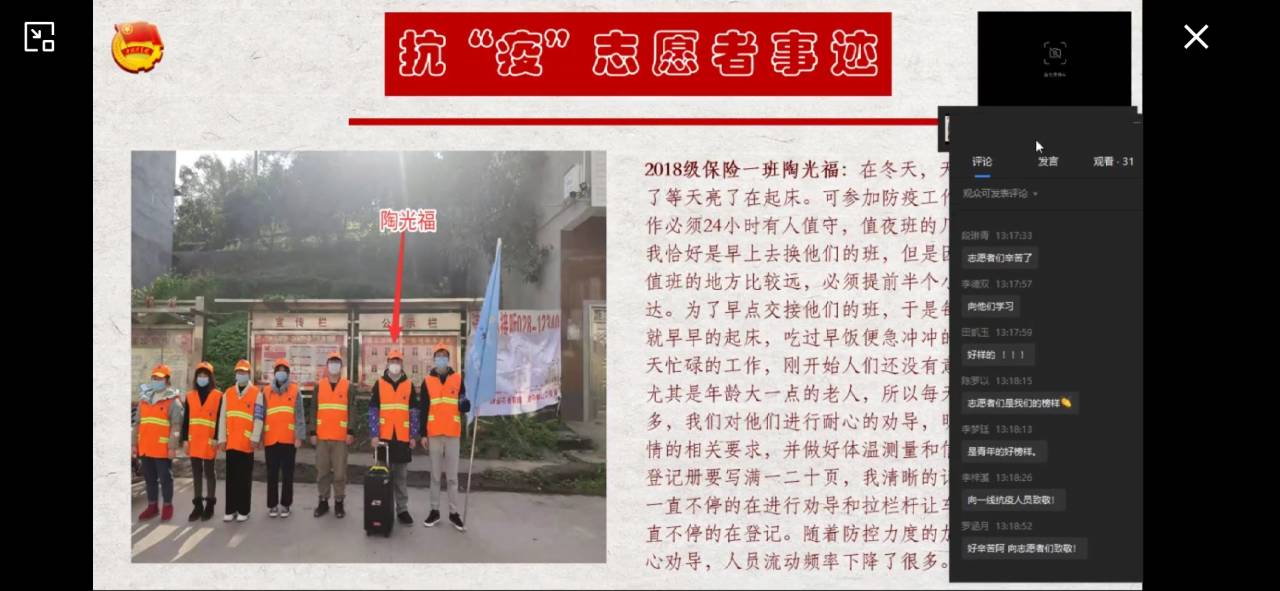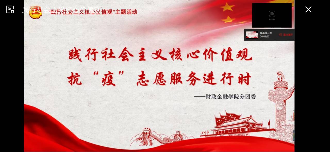 本次活动的主要内容为分享奋战在抗“疫”前线的财金学子故事,身体力行践行社会主义核心价值观。活动伊始,主持人分享了2018级保险一班陶光福的抗“疫”故事。陶光福说:“在冬天天气比较冷,我习惯了等天亮了再起床。但参加防疫工作之后,为了早点接替那些值夜班的民兵叔叔,我每天很早就起来。吃过早饭就赶往卡点进行志愿服务”陶光福每天奔波于家里和卡点之间,对过往人员进行劝导,告知他们政府的相关要求,并对他们进行体温测量与登记。作为财金学子的一员,2018级财政二班朱媛媛、沈玥,在疫情期间加入“中国-意大利抗疫物资信息沟通渠道”团队,为远在地球另一端的意大利人民送去中国员工的温暖与祝福。