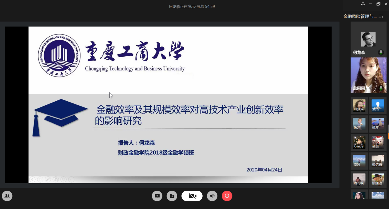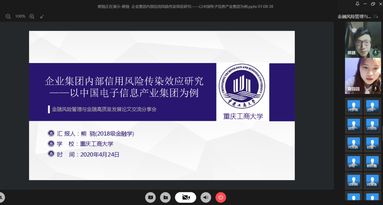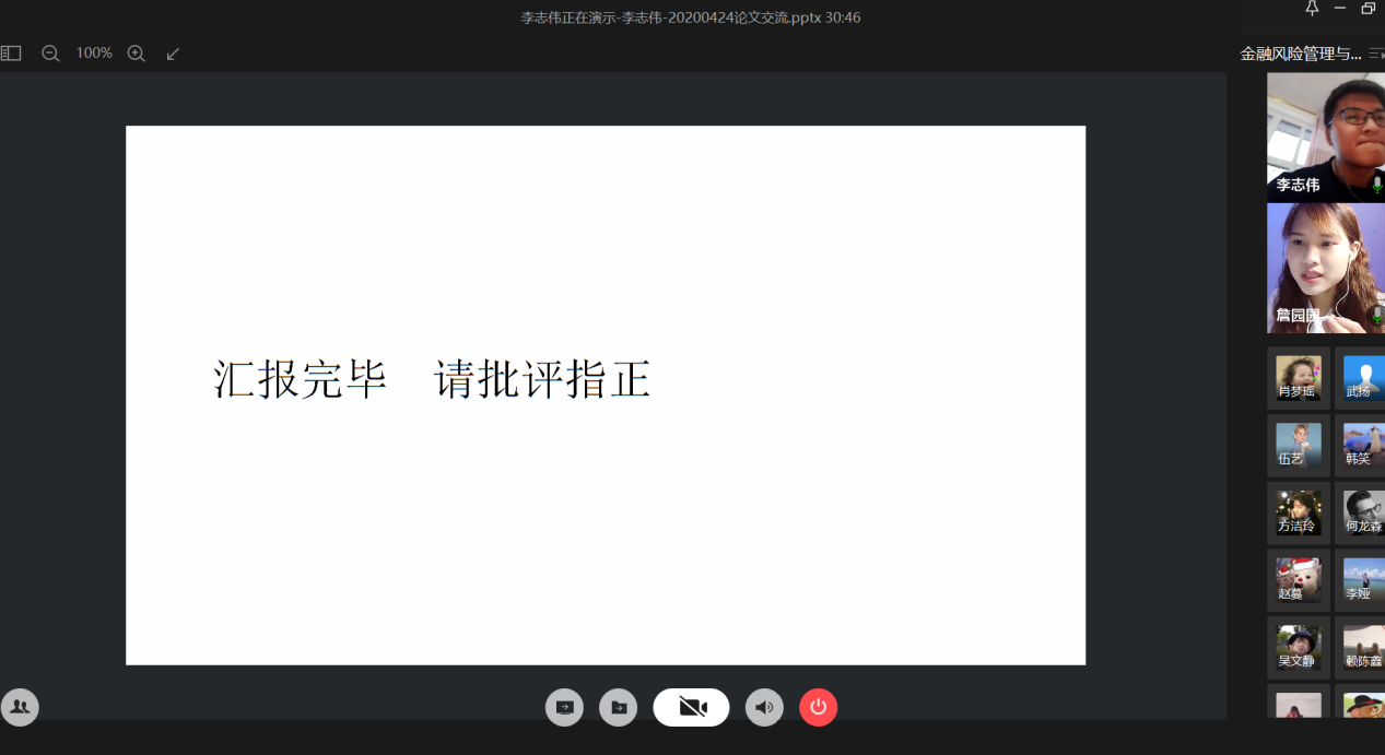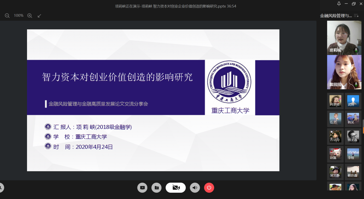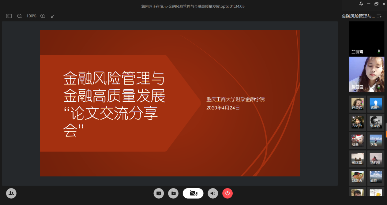 4月24日晚上,财政点点taptap官方网站研究生分会通过腾讯会议成功举办了“金融风险管理与高质量发现”论文交流会。本次交流会由研分会的文体部部长詹园园主持,18级金融学硕的李志伟、项莉峡、何龙森、熊骁四位同学分享了他们的论文框架及论文写作经验。