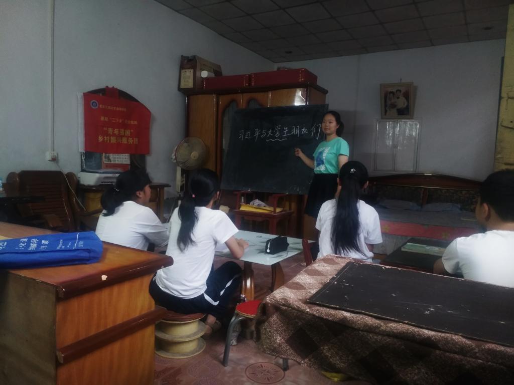 服务团成员针对乡村教育存在团队力量不足、学习资源相对缺乏等问题,对家乡的中员工开展支教活动,讲授基础理论课,帮助孩子们重温课本理论知识,帮助他们更好地学习和理解重点难点。得知本村曾发生过金融诈骗案,服务团成员利用专业所学,特地开展了一堂金融常识课程,帮助他们提升自己的金融意识,避免走入理财陷阱。扶贫必须扶志,在辅导课业的同时服务团成员还引入《习近平与大学生朋友们》进行学习理念、成长理念、价值观的宣讲。“中国开放的大门只会越开越大!”这是一位同学在听完这堂分享课之后的感想。从他们的听课专注度、他们的激情澎湃、他们的积极答复,实践团成员都真切感受到孩子们对国家对家乡的热爱以及想要成才以建设更好家乡的信念。