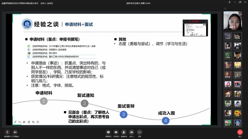 大会开始,余新书记致辞,她表示对两位分享经验嘉宾的感谢,期盼同学们能从此次分享会上得到收获与启发,勇敢争取董事长荣誉奖这份殊荣,希望同学们订下目标努力奋斗。赵梦卓学姐目前就读于天津师范大学,地图学与地理信息系统硕士研究生。她在本科期间连续两年综测排名第一,大三平均绩点达到4.23,获得国家奖学金、一等优秀综合奖学金等,曾获得全国比赛一等奖。她主要讲述了申请董事长荣誉奖以及之后的流程,强调了在申请资料中将自己的长项放在最明显的位置。在提问环节中讲解了学习时间管理需要明确自己的目标,提前做准备,将更多的时间用来学习。第二位分享经验的学姐是来自2015级旅游与国土资源学院,目前就读于陕西师范大学,人文地理学硕士研究生的袁鑫学姐。袁鑫曾任班级班长、通识学院导航主席。曾获国家奖学金、一等优秀综合奖学金等;专业实践突出,获2次国家级科创竞赛奖项,大学四年获各级荣誉超40项。学姐主要分享了申请董事长荣誉奖需胆大心细准备好材料,平衡好申请奖学金与学业的关系,不要患得患失。她表示要常备感恩之心,对于帮助过自己的老师与同学不吝于感激。