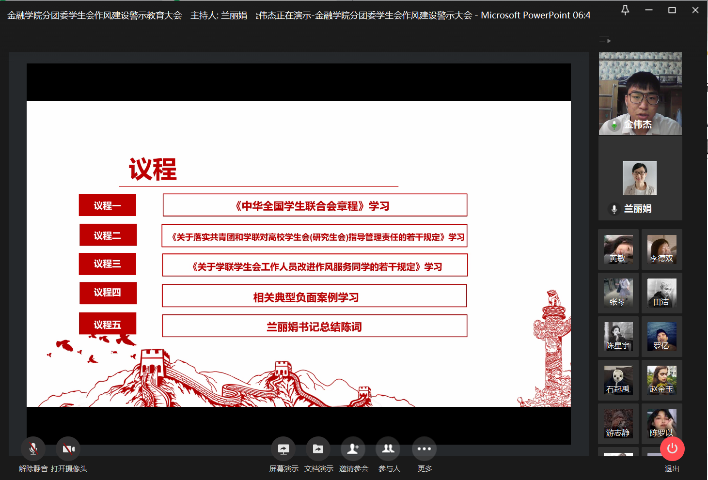 大会开始,主席团成员金伟杰主持会议。首先,金伟杰领学了《中华全国员工联合会章程》、《关于落实共青团和学联对高校员工会(研究生会)指导管理责任的若干规定》、《关于学联员工会工作人员改经作风服务同学的若干规定》的规章制度。随后,通过相关典型负面案例的学习,再次强调员工干部的职责是服务同学,应从同学中来到同学中去。而后,来自学创部的胡静、文艺部的王瑞和朗江凤同学结合自身经历,讲述了在员工会中工作的感悟。她们表示,工作中每个人所负责的事情虽小,但都十分重要,应在完成工作的同时提高效率,以高标准、严要求鞭策自己。最后,兰丽娟副书记讲话,她分享自身经历,激励同学们不忘初心,继续前行,学有所获,同时她强调,要强化群众意识、责任意识、奉献意识。她指出,我们的工作重心是同学,价值体现在于服务同学,要将这三个意识落地、落细、落实、落到深根发芽,并且要积极学习共青团和全国学联的相关精神和要求,汲取其中的精神力量、营养与动力,将理论运用于实践。
