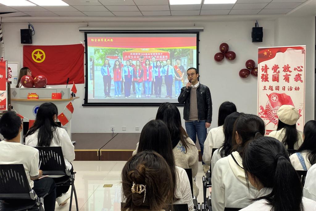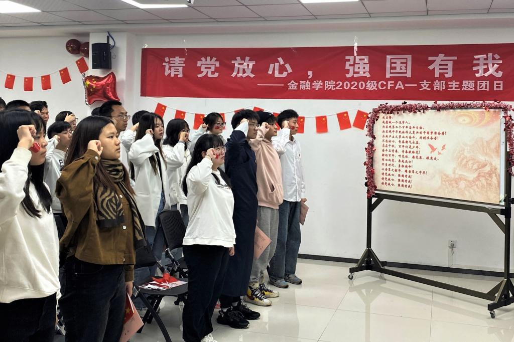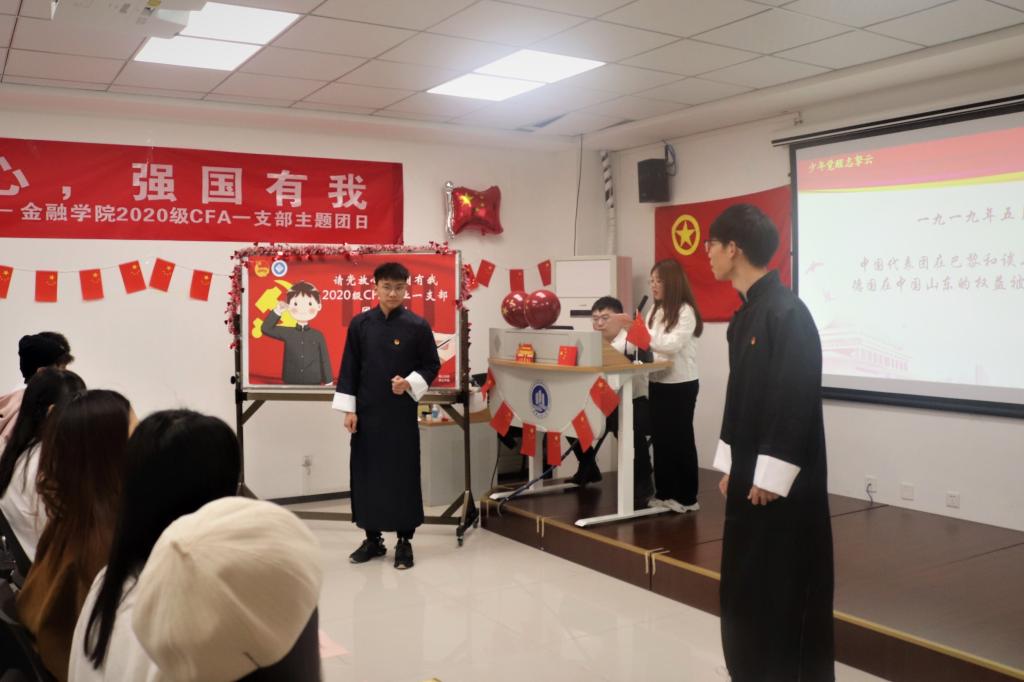 活动伊始,全体团员起立,合唱团歌,整齐嘹亮的歌声充分展现少年气魄。首先,诗朗诵《少年中国说》振奋全场,同学们带着激情昂扬的精神风貌,回顾巴黎和会的谈判与五四运动的爆发,感悟其中的使命与责任,同时通过连线老党员,体悟先辈拏云志,振奋红色精神。随后,一首《沁园春·雪》将磅礴的山河历史画卷徐徐展开;一条《中国一分钟》,把中国复兴之路的历程一一展现,同学们纷纷进行自己的一分钟分享,并邀请黎毅老师分享金融学子践行“请党放心 强国有我”铮铮誓言的生动实践。接着,同学们学习了习近平总书记“七一”重要讲话精神,重温习近平总书记对青年的寄语,紧扣中华民族伟大复兴的中国梦,分享写给未来自己的一封信。最后,全体起立进行庄严宣誓。“请党放心,强国有我!”铿锵有力的誓言响彻教室。