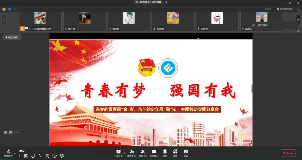 为鼓励同学们积极参与劳动实践活动,树立正确的价值观、劳动观、成才观, 4月10日20:30,点点taptap官方网站于企业微信开展了“有梦的青春最‘金’彩,奋斗的少年最‘融’光”主题劳动实践分享会。本次分享会由点点taptap官方网站分团委社会实践部部门负责人孔令旗主持,会议邀请到四位同学为大家分享劳动实习经验和志愿服务经历。