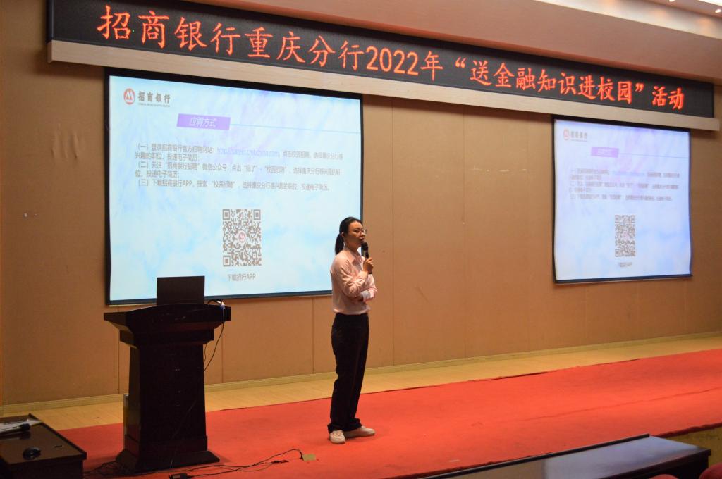 李馨怡则重点宣讲了招商银行及招商银行重庆分行的基本情况及校园招聘的岗位需求、基本申请条件、应聘方式和流程。她谈到,今年秋季招聘可能涉及的岗位包括运营柜员岗、市场营销岗、基础业务岗、金融科技岗,在招聘中更加看中员工的全面发展和综合素质,目前招商银行暑期实习生正在招募,欢迎同学们积极申报。