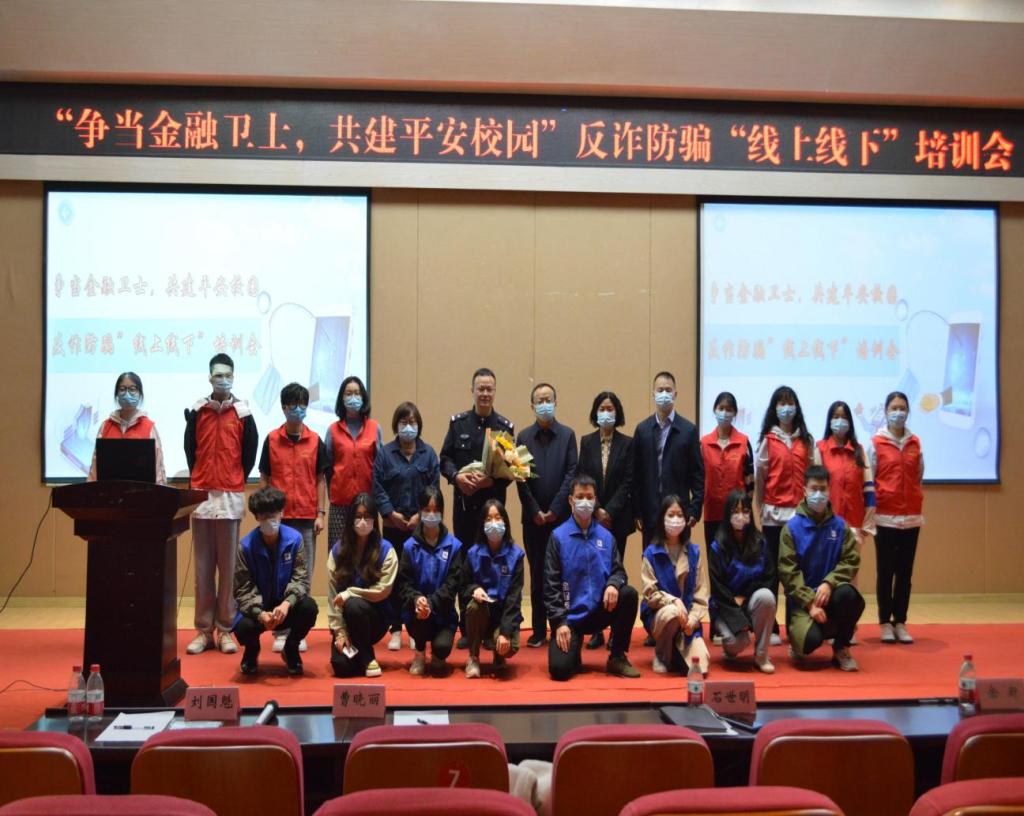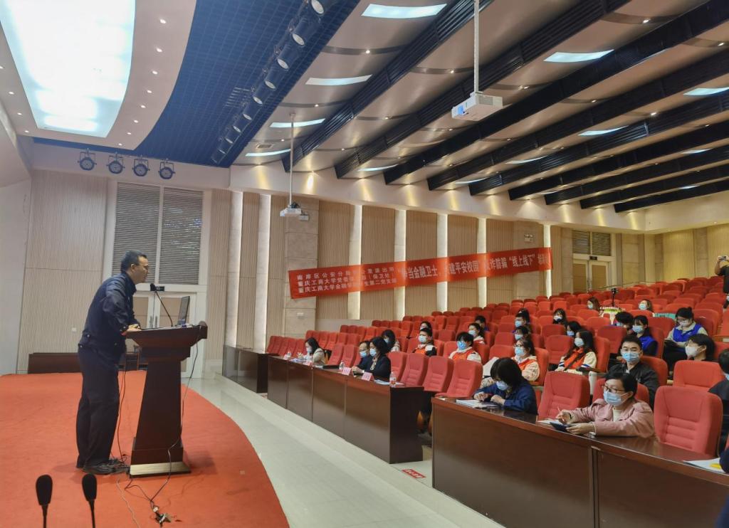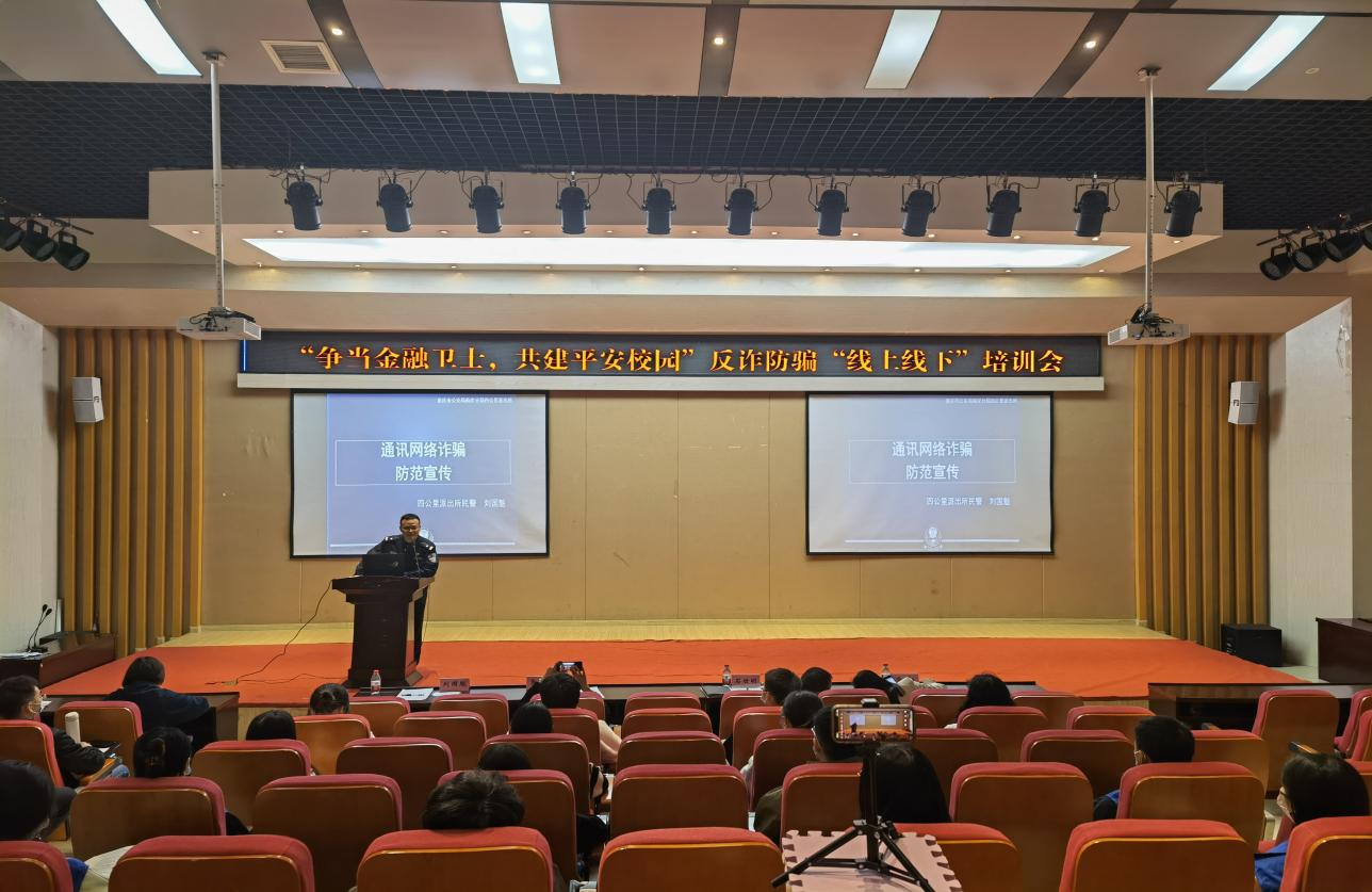 2022年10月28日,为普及防范诈骗知识,进一步提升员工的反诈防骗能力,南岸区公安分局四公里派出所、点点taptap官方网站党委保卫部(保卫处)以及点点taptap官方网站在田家炳209报告厅联合举行“争当金融卫士,共建平安校园”反诈防骗“线上线下”培训会。重庆市南岸分局四公里派出所警官刘国魁,公司党委保卫部副部长(保卫处副处长)曹晓丽,公司党委书记、副经理石世明,公司党委副书记、纪委书记余新,公司党委委员、专职组织员赵甫刚及全体辅导员老师出席了培训会。“金融卫士”团队及员工第二党支部(双创)代表参加了现场培训,其他同学同步线上观看直播。