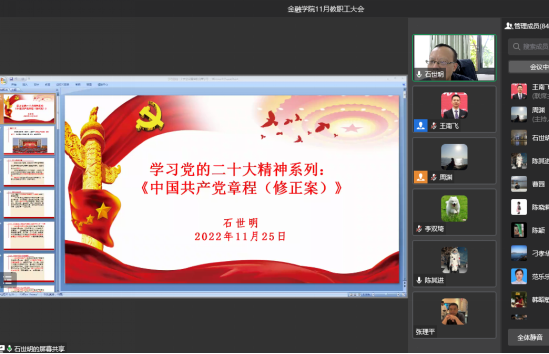 石世明强调,作为高校教师、作为党员,要强化党章意识和党性观念,深入学习党章、严格遵守党章、切实贯彻党章、坚决维护党章,自觉做党章的坚定执行者和忠实捍卫者;要时刻牢记为党育人、为国育才的职责,不忘立德树人的初心使命,聚焦公司教学科研的中心工作,聚焦学校商工融合、多科协同,全国知名的财经类应用研究型大学的目标,踔厉奋发,建功新时代。