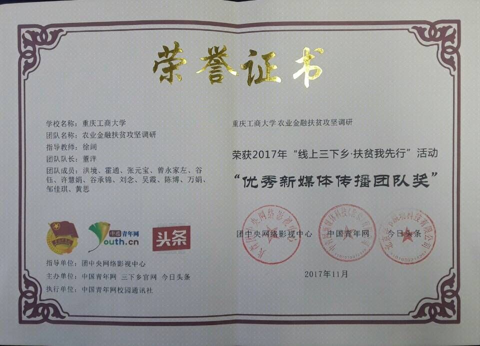 近日,公司农业金融扶贫攻坚调研团荣获2017年团中央“线上三下乡·扶贫我先行 ”活动“优秀新媒体传播团队奖”, 据悉,在此次活动中,农业金融扶贫攻坚调研团在线上为30万余人答疑解惑。