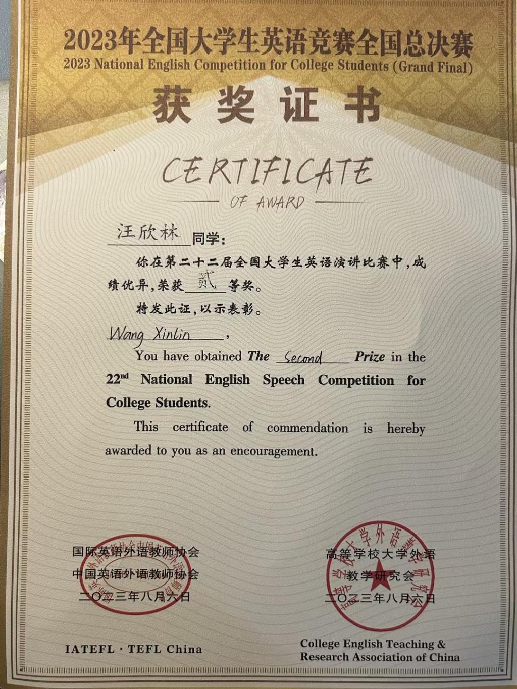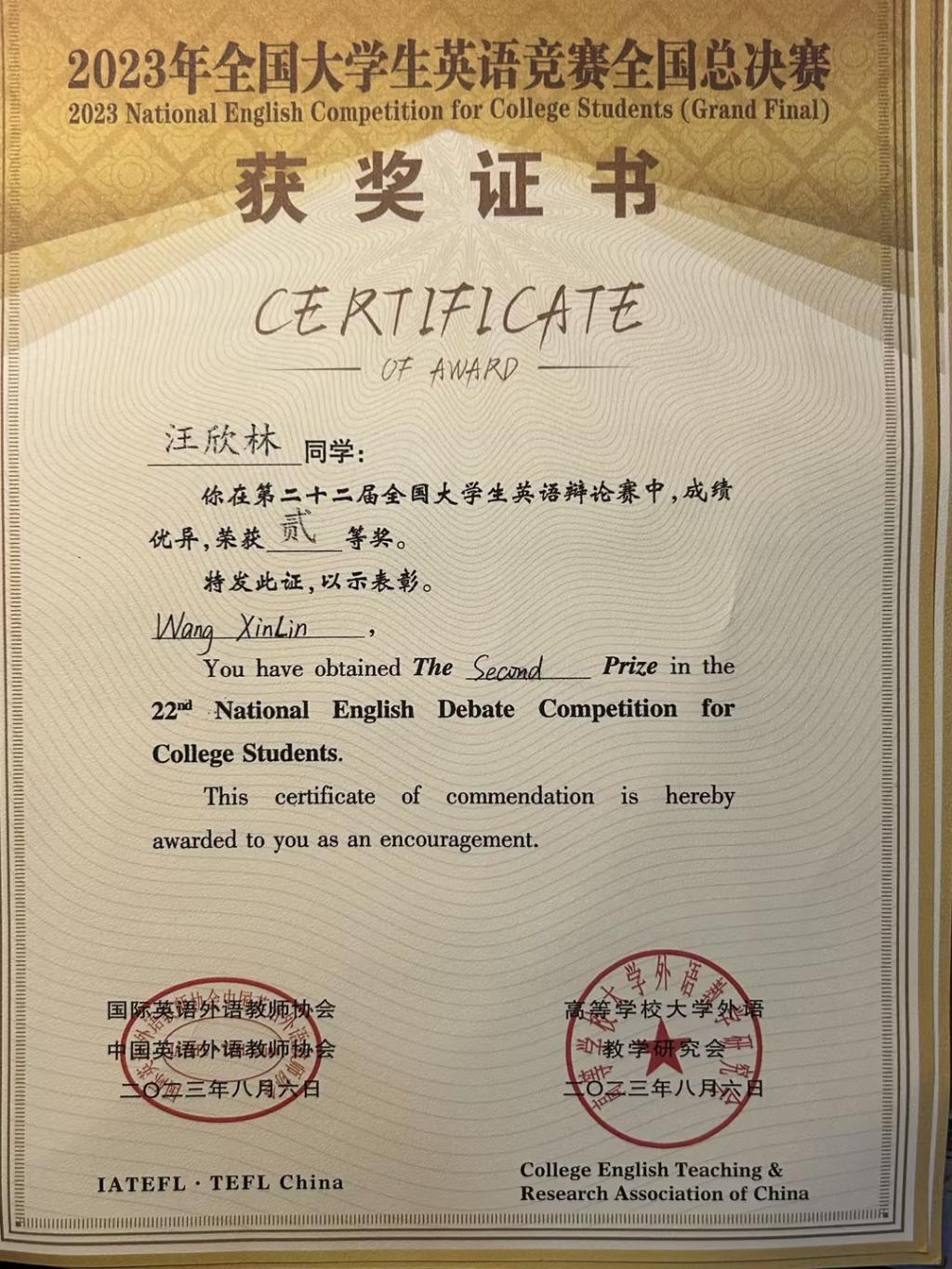 2023年全国老员工英语竞赛(NECCS)全国总决赛于8月2日——7日在宁夏回族自治区银川市举行。全国共有来自29个省、自治区、直辖市的208所高校共计373名选手参加了本届总决赛活动。参赛选手均是在2022年和2023年全国老员工英语竞赛中获得特等奖或参赛院校竞赛成绩第一名的英语学习佼佼者。公司22级CFA1班汪欣林同学代表点点taptap官方网站参加了本次比赛。