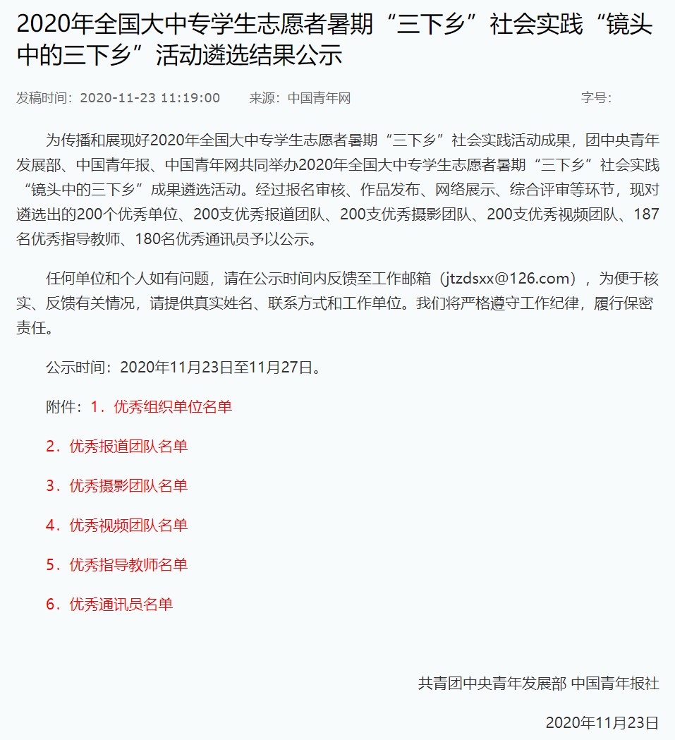据悉,此次“镜头中的三下乡”评选活动共收到来自全国1500余所学校33000余支团队提交的320000余篇参赛作品,最终评选出200个优秀单位、200支优秀报道团队、200支优秀摄影团队、200支优秀视频团队、187名优秀指导教师、180名优秀通讯员。